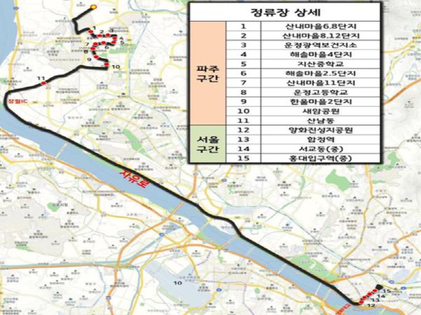 총 12대의 버스가 13~20분 간격으로 운행하며 산내마을 6, 8단지에서 출발해 운정신도시와 산남동 등 파주구간 11개 정류소에 정차 후 자유로를 통해 양화진성지공원, 합정역, 서교동 등을 경유한다.