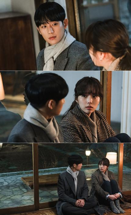 이 가운데 한밤 중 정해인의 짝사랑 추억이 서려있는 배송지에서 만난 정해인과 채수빈의 스틸이 공개돼 시선을 강탈한다. 유리창에 등을 기대고 나란히 앉아 서로를 바라보고 있는 두 사람의 모습에서 느껴지는 달콤한 긴장감이 심장 떨림을 자아낸다. 특히 채수빈을 바라보는 정해인의 눈빛에는 궁금증과 놀람이 동시에 서려 있는 듯해 궁금증이 모아진다. 이에 정해인과 채수빈이 어둠이 내려앉은 밤, 배송지에서 마주한 이유는 무엇일지 관심이 고조된다.
