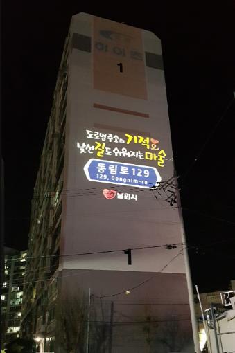 남원시가 야간 시인성과 경관디자인 효과가 뛰어난 레이저형(Laser) 도로명 안내시설을 8개소에 추가 설치한다. 남원시는 지난해 전라북도 최초로 레이저형 도로명 안내시설을 의회 청사, 광한루 등 주요 관광지 7개소와 주요 시내 아파트 벽면 8개소에 설치하여 뛰어난 시인성으로 도로명주소 인지 효과를 높임은 물론 다양한 시정 홍보로 시민들에게 많은 호응을 얻고 있다.