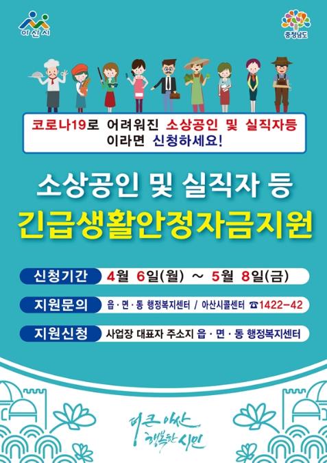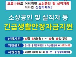 아산시(시장 오세현)가 4월 6일부터 5월 8일까지 ‘코로나19 소상공인 및 실직자 긴급생활안정자금’을 사업장 대표자 주소지 읍면동 행정복지센터에서 신청·접수한다.
