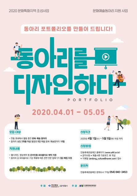 (재)안동축제관광재단은 문화특화지역 조성사업의 일환으로 오는 5월 5일까지 문화예술동아리 포트폴리오 제작 지원 사업 ‘동아리를 디자인하다’에 참여할 동아리를 모집한다.
