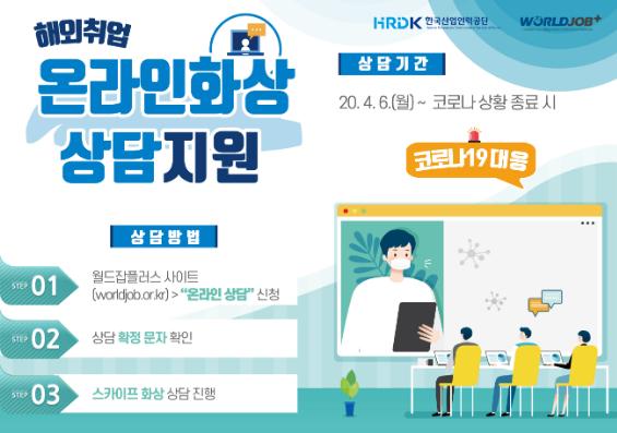 한국산업인력공단(이사장 김동만)은 ‘사회적 거리두기’ 캠페인의 일환으로 해외취업센터까지 찾아오기 어려운 청년들을 지원하기 위해 4월 6일부터 ‘온라인 화상 상담 서비스’를 시작한다.