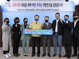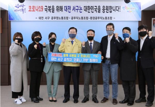 대전광역시 서구 공무원노동조합(위원장 류인규), 공무직노동조합(지부장 정효영), 환경노동조합(위원장 이병헌, 지부장 문부식)은 6일 코로나19 극복 지역사회 고통 분담을 위해, 직원들의 자율적인 참여로 뜻을 모은 성금 1,482만 원을 사회복지공동모금회에 전달했다.