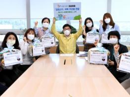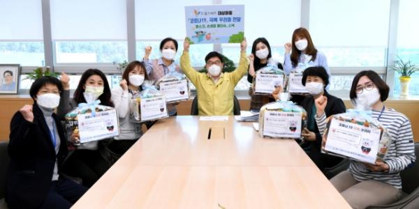 이날 전달식에는 신동헌 시장과 드림스타트 아동통합사례관리사 5명 등이 참석했으며 의료용 덴탈마스크 10매, 손세정 물티슈 2개, 스낵 5봉을 ‘코로나19 극복 꾸러미’로 만들어 전달했다.