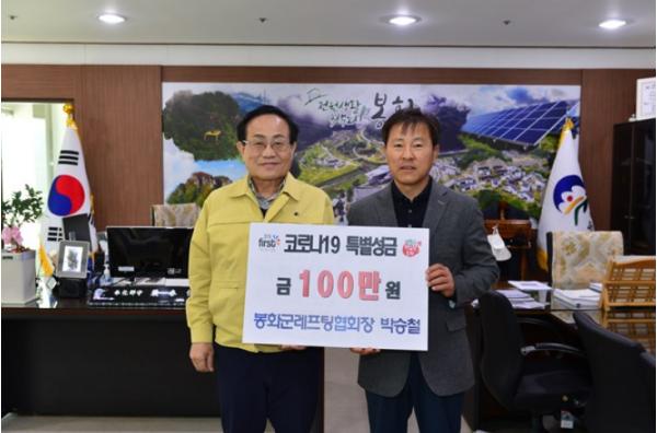 봉화군 레프팅협회(협회장 박승철)와 (합)태광건설(대표 박승철)에서 지난 3월말 봉화군청을 방문하여 코로나19 극복을 위해 써달라며 특별 성금 200만원을 기탁했다.