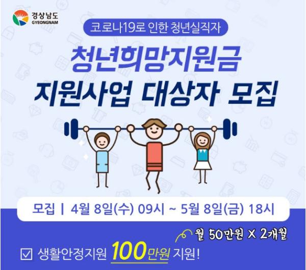 경상남도와 공동 추진하는 이 사업은 코로나19 확산으로 기간제 ㆍ 일용근로 ㆍ 아르바이트 등에서 비자발적으로 퇴직하거나 해고된 청년의 생활안정과 사회진입활동 촉진을 위한 사업이다.
