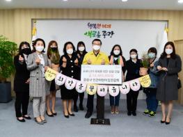 국공립어린이집연합회와 가정어린이집연합회에서는 코로나19로 인하여 고생하는 공무원들을 격려하기 위하여 간식 470인분을, 민간어린이집연합회에서는 68개 어린이집 및 보육교직원 576명이 성금을 모아 총 14,489,000원을 기탁하였다. 특히 보육아동 감소로 어린이집 운영이 어려운 상황에서도 해오름어린이집 원미경 보육교사가 3월 급여를 기부하여 지역사회의 귀감이 되고 있다.