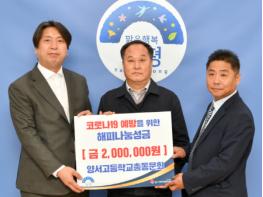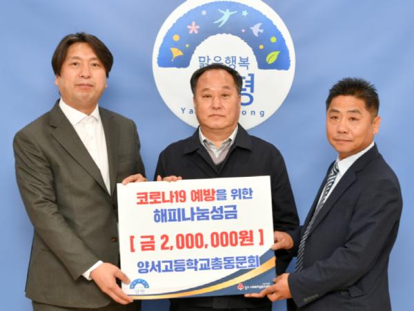 6일 양평군에 코로나19 확산방지를 위해 양서고등학교총동문회(회장 양재원)에서 성금 200만원, 양평농협본점(대표 한현수)에서 성금 500만원을 양평군에 기탁하였다.