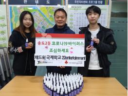 이에 송도2동장은 “어려운 시기에 코로나19를 극복하기 위해 손소독제를 기부해 준 학생들에게 감사드린다”며 “이렇게 작지만 따뜻한 나눔의 손길들이 모인다면 이 위기 상황 또한 잘 극복해 나갈 수 있을 것”이라고 말했다.
