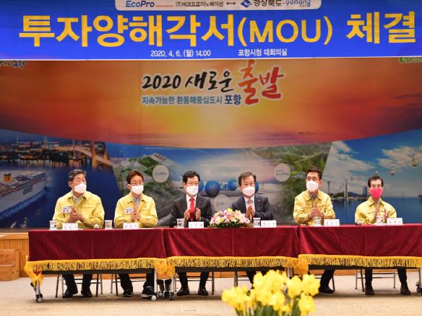 경상북도는 코로나19 이후 경제살리기 첫 행보로 6일 포항시청에서 포항시, ㈜에코프로이노베이션과 투자양해각서를 체결했다고 밝혔다. ㈜에코프로이노베이션은 이차전지 양극재용 수산화리튬 제조업체다.