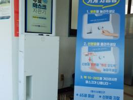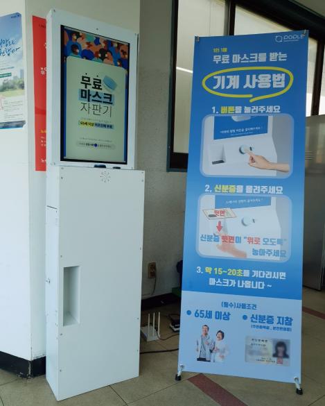마스크 자판기는 사용자 버튼을 누르고 신분증을 확인한 후 화면에 나오는 코로나19 예방수칙 영상을 시청하면 마스크를 지급받을 수 있게 되어있다.