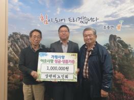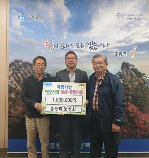 가평군 조종면 상판리 노인회(노인회장 박래선)는 7일 자체 모금을 통해 마련한 100만원을 어려운 가정에 써달라며 조종면행정복지센터 맞춤형복지팀을 찾아왔다