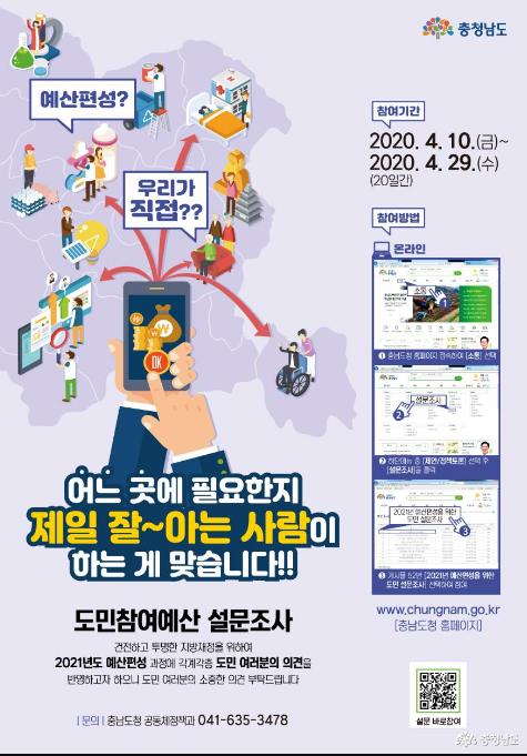 설문 내용은 총 15개 문항으로 △2021년 중점 투자분야에 대한 우선순위 △분야별 우선 추진이 필요한 세부사업에 대한 우선순위 △충남도 예산운영에 바라는 점 등이 포함됐다.