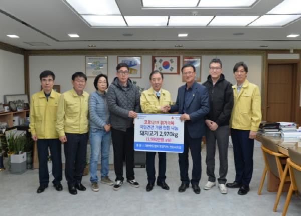 포천시는 지난 9일 대한한돈협회 포천시지부(지부장 최영길)에서 코로나19 확산으로 어려움을 겪고 있는 이웃에게 전달해달라며 1,990만 원 상당의 돼지고기 2,970kg을 기탁했다고 밝혔다.