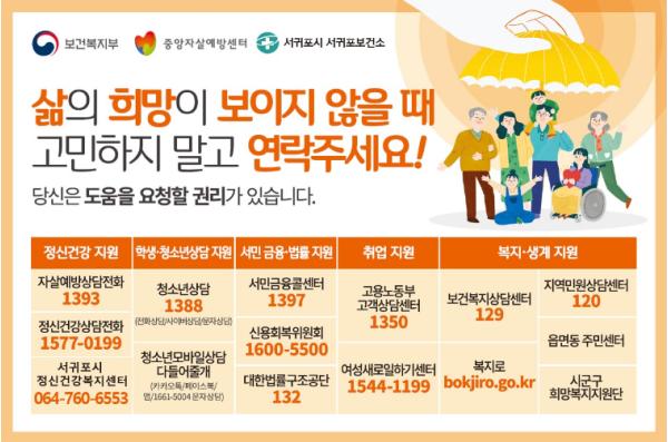 서귀포보건소(서귀포시정신건강복지센터)는 봄철 자살률이 증가하는 경향에 따라 3월부터 5월까지‘자살 고위험 시기 집중홍보 기간’ 으로 정해 자살예방활동을 적극적으로 추진하고 있다.