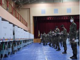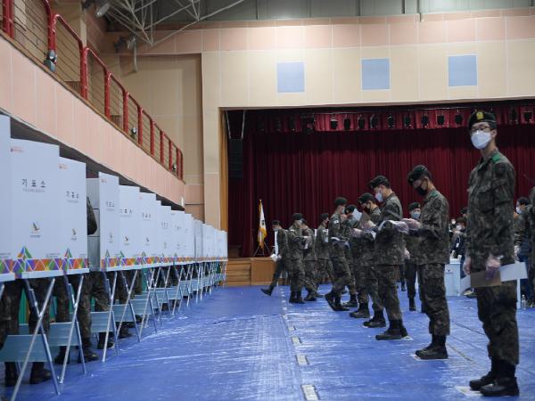 제 21대 국회의원 선거 사전투표 첫날인 4월 10일 연무문화체육센터에 마련된 사전투표소에서 논산 육군훈련소 훈련병과 장교 및 기간병들이 투표를 하고 있다.