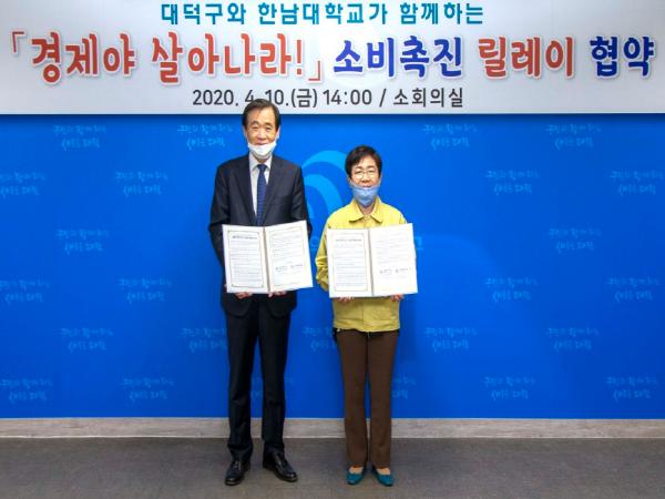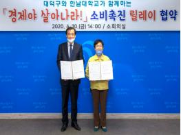 대전 대덕구(구청장 박정현)가 지난 10일 구청에서 코로나19로 인한 경기침체 극복을 위해 한남대학교(총장 이광섭)와 ‘경제야 살아나라!’소비촉진 릴레이 협약을 맺었다.