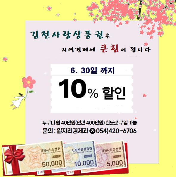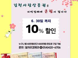 한편, 김천시는 김천사랑 상품권 10% 특별할인 판매기간을 6월 말까지 연장하고, 당초 200억 발행계획이던 김천사랑 상품권 발행금액을 500억까지 확대하여 운영한다. 또한, 모바일앱 및 선불형카드 김천사랑 상품권을 5월 중 조기 도입해 얼어붙은 소비심리를 회복시켜 지역 경제에 활력을 불어넣을 계획이다.