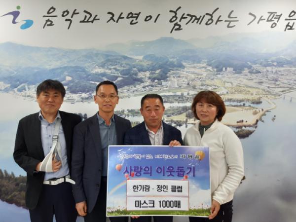 가평읍 한가람(회장 이기학)·정인(회장 신진섭) 테니스클럽은 9일 가평읍 행정복지센터를 방문하여 마스크 1,000개를 전달했다.