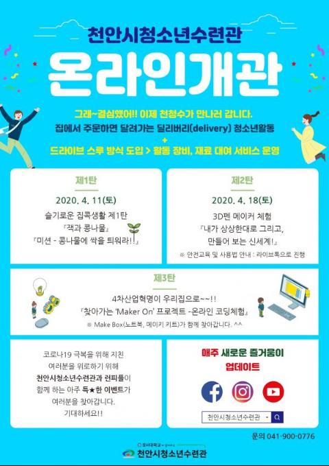 천안시청소년수련관이 코로나19 확산으로 인한 임시휴관 장기화에 따라 11일 온라인 개관을 시작으로 비대면 활동 콘텐츠로 새로운 청소년활동 서비스 제공을 확대한다.