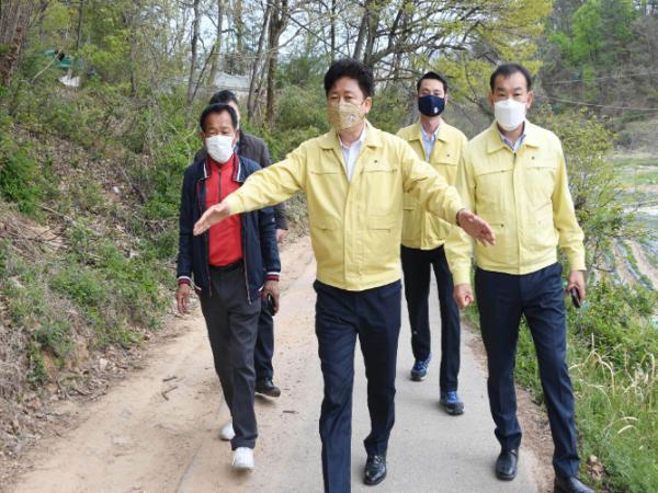 지난 10일 박태완 중구청장이 중구 내약사의 좁은 농로로 불편을 겪고 있는 민원현장을 방문해 해결방안을 살펴보고 있다.