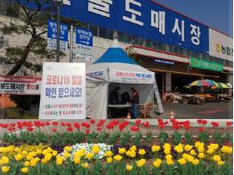 시는 다중이용시설인 농산물도매시장 내 코로나19 확산방지를 위하여 발열 확인 부스를 설치 운영 중에 있으며, 도매시장 시설전역에 대대적인 방역을 실시하고, 경매장, 공용화장실 등에 손 소독제 비치, 마스크 착용 현수막 게첨, 개인위생 실천 홍보방송 등을 실시함은 물론 도매시장 법인, 중도매인 등 모든 유통종사자의 역할을 점검하고 철저한 대응을 추진해 왔다.