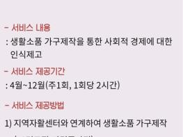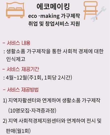 취·창업서비스의 경우 지역자활센터와 연계하여 생활소품 가구를제작하고, 전시 및 판매를 실시하여 경제활동에 대한 경험을 제공한다.