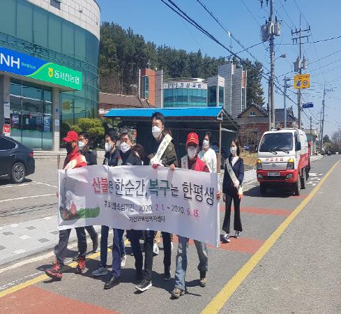 이번 캠페인은 면 직원과 산불감시원 등 15명이 참여했으며, 코로나19 예방을 위해 참석자 모두 마스크를 착용하고 비대면 방식의 가두행진 캠페인을 펼쳤다.