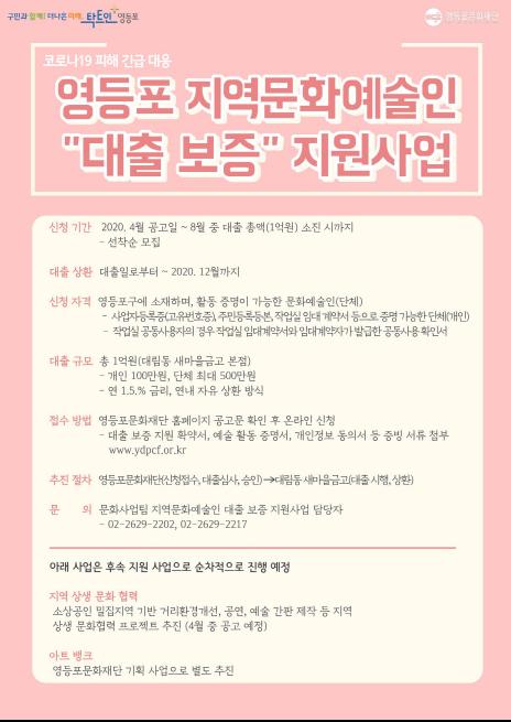 예술인 신용보증 대출을 희망하는 경우 오는 8월까지 영등포문화재단 홈페이지(www.ydpcf.or.kr)에서 신청할 수 있으며, 영등포문화재단은 1억이 소진될 때까지 심의를 거쳐 순차적 지원할 예정이다.