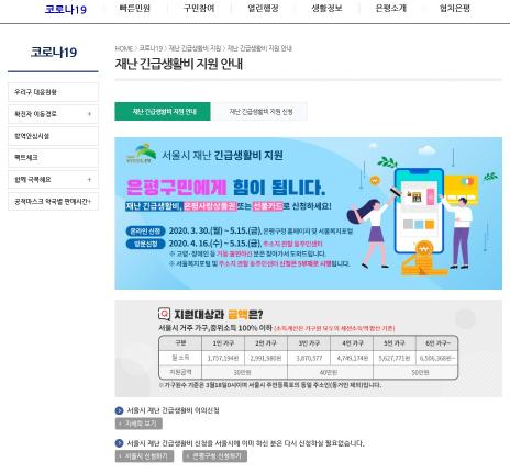 ‘서울시 재난 긴급생활비’는 코로나19로 인해 생계위기에 직면한 중위소득 100% 이하 가구에 대하여 1~2인 가구는 30만원, 3~4인 가구는 40만원, 5인 이상 가구는 50만원을 선불카드 또는 은평사랑상품권으로 지급하고 있으며, 지난달 30일부터 서울복지포털(wiss.seoul.go.kr)을 통해 온라인 접수 받고 있다.