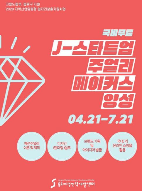 ‘J-스타트업 주얼리메이커스 양성과정’은 4월 21일부터 7월 21일 매주 월요일부터 금요일까지 1일 4시간, 총 240시간 과정으로 진행된다. 패션 주얼리 분야 창업을 희망하거나 프리마켓 등을 통한 일자리 창출을 희망하는 미취업 구직자를 위해 고용노동부와 종로구 지원으로 교육비와 재료비를 100% 지원한다.