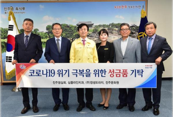 재단법인 진주시복지재단은 16일 오후 4시 30분 진주시청 기업인의 방에서 코로나19 대응을 위한 지역사회 기관·단체들의 성금 및 성품 기탁식을 가졌다.