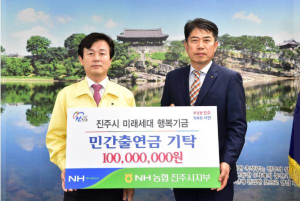 진주시(시장 조규일)는 16일 오후 4시 시청에서 지역사회 공헌을 위해 노력하는 대표 금융기관인 NH농협 진주시지부(지부장 정대인)와 미래세대 행복기금 기탁식을 가졌다.