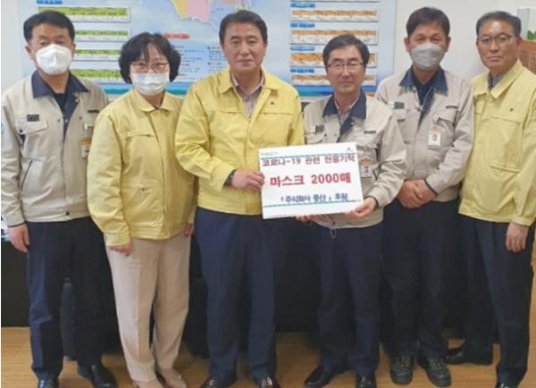 ㈜풍산 안강사업장의 임직원들이 지난 14일 북경주행정복지센터를 방문해 코로나19 예방을 위해 사용해달라며 마스크 2천매를 기탁했다.