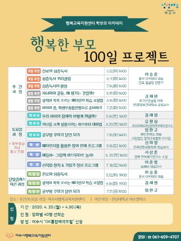 여수시(시장 권오봉)는 오는 20일부터 30일까지 ‘행복한 부모, 100일 프로젝트’를 주제로 2020년도 학부모 아카데미 수강생을 모집한다.