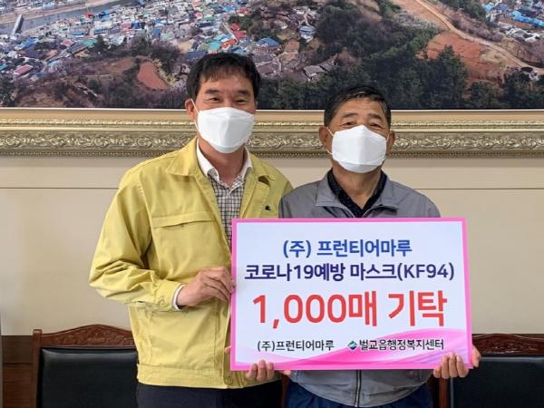 ㈜프런티어마루(사장 유재석)는 지난 16일 보성군 벌교읍행정복지센터에 코로나19 예방을 위한 마스크 1,000매(150만원 상당)를 기탁했다.