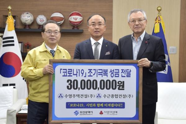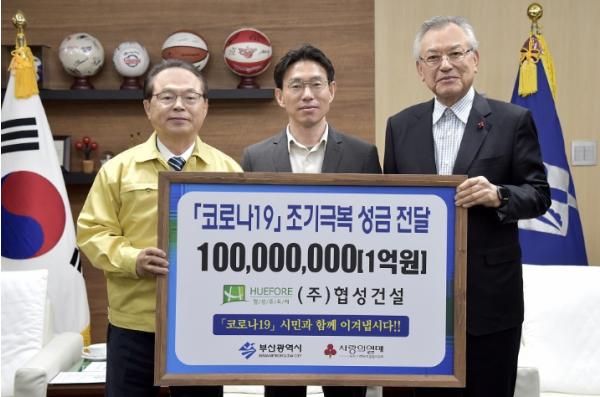 ㈜협성건설은 1억 원을, 수근종합건설㈜은 3천만 원의 성금을 부산시에 전달했다. 전달된 기부금은 부산사회복지공동모금회를 통해 코로나19로 어려움을 겪고 있는 소규모업체와 의료진을 비롯한 취약계층, 소외계층 등을 위해 사용될 예정이다.