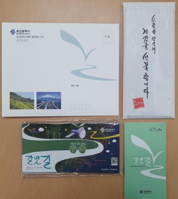 기존에는 행정봉투를 이용하여 갈맷길 안내지도 등을 담아 신청자들에게 보냈다면, 앞으로는 새로 제작한 갈맷길 우편봉투에 안내지도, 인증수첩과 “소중한 당신께 건강을 선물합니다.”라는 문구가 들어간 선물용 한지봉투를 담아 보낸다. 갈맷길 이용자들에게 소소하지만 확실한 행복, 소확행의 의미를 담는다.