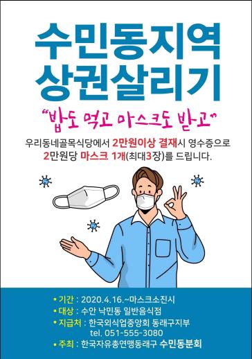 코로나-19 여파로 장기화됨에 따라 어려움을 겪는 동네 음식점을 지원하기 위해 회원들과 함께 고민하여 마련한 캠페인으로 한국자유총연맹 수민동분회는 수안·낙민동 소재 일반음식점에 홍보 포스터를 부착하고 KF94 마스크 1,000장을 한국외식업중앙회 동래구지부에 전달했으며, 영수증을 제시하는 손님들에게 배부할 예정이다. 김순규 회장은 “지역경제 위축에 따른 동네 음식점의 어려움을 조금이나마 힘을 주기 위해 회원들의 의견을 반영하여 이번 캠페인을 실시하게 되었으며, 수민동을 시작으로 지역경제 활성화를 위한 작은 발걸음이 전동에 파급되기를 바란다.”고 말했다.