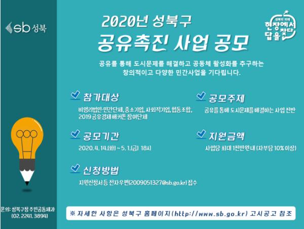 이승로 성북구청장은 “공유촉진 공모사업을 통해 공유경제가 활성화 되어 일자리를 창출하고 공동체를 복원하며 도시문제를 해결하는 공유문화가 지역 곳곳에 전파·확산되기를 바란다.”고 전했다.
