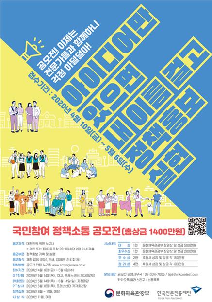 문화체육관광부(장관 박양우)는 각 부처 정책 담당자들이 국민과 함께 정책을 직접 홍보하는 ?국민참여 정책소통 공모전(4. 10.~5. 6.)’을 진행한다.