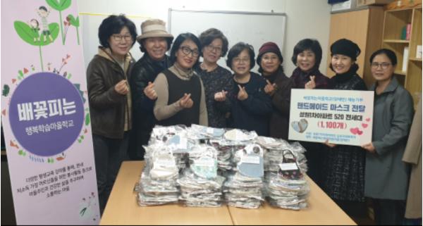 의왕시 오전동 성원1차 아파트에 위치한‘배꽃피는 행복학습마을학교’(교장 박찬덕)에서 지난 17일 코로나19 확산 방지를 위해 핸드메이드 친환경 마스크 1,100장을 제작하여 성원1차 이화아파트 입주자대표(회장 이보형)에게 전달했다.