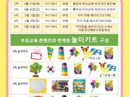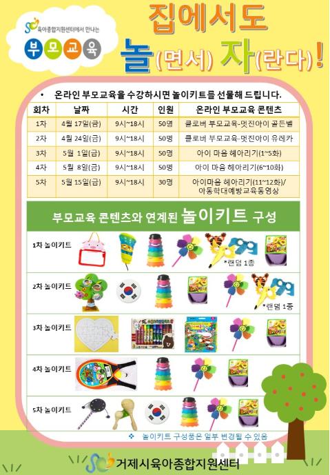 교육대상자는 유튜브 부모교육 컨텐츠를 시청한 후 교육후기가 담긴 놀이키트 신청서를 거제시육아종합지원센터로 제출하면 1인당 13,000원 상당의 놀이키트를 택배로 받을 수 있다.