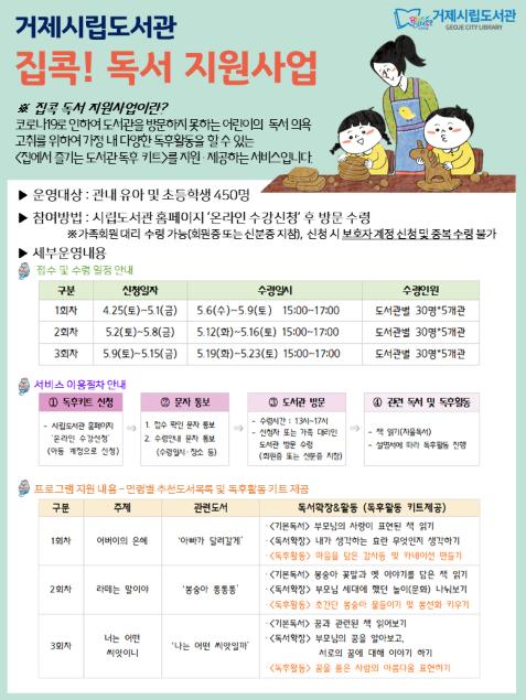거제시(시장 변광용)는 코로나19로 인한 도서관 휴관 장기화에 따른 대비책으로 실시중인 안심예약대출서비스 활성화와 가정 내 독서 의욕 고취를 위해 ‘집콕독서’ 지원 사업을 운영한다고 밝혔다.