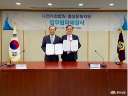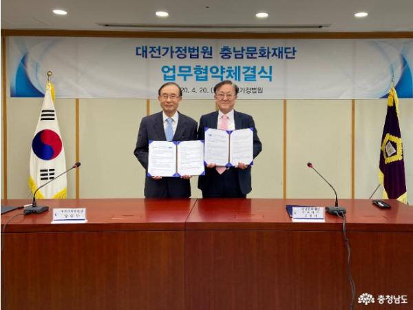 이날 협약식은 대전가정법원에서 2시부터 개최되었으며, 충남문화재단 김현식 대표이사와 대전가정법원 방승만 법원장이 참석해 서로의 협약서를 교환했다.