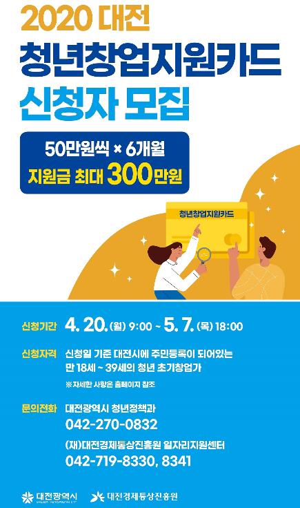 대전시는 창업 초기 경제적 어려움을 겪는 청년 창업가들에게 최대 300만 원을 지원하는 ‘청년 창업지원카드 사업’을 앞당겨 시행한다고 21일 밝혔다.