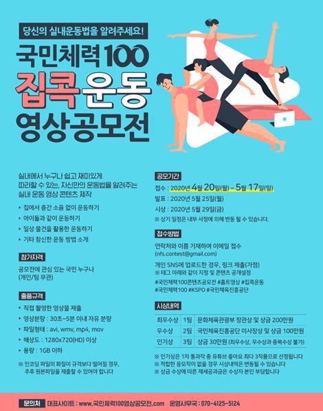 4월 20일(월)부터 5월 17일(일)까지 ‘집콕운동’을 주제로 대국민 영상 공모전도 열린다. 국민 누구나 ‘집에서 층간소음 없이 운동하기’, ‘아이들과 같이 운동하기’, ‘일상의 물건을 활용한 운동하기’등을 촬영한 ‘실내운동’영상을 누리소통망을 통해 공모하면 된다.