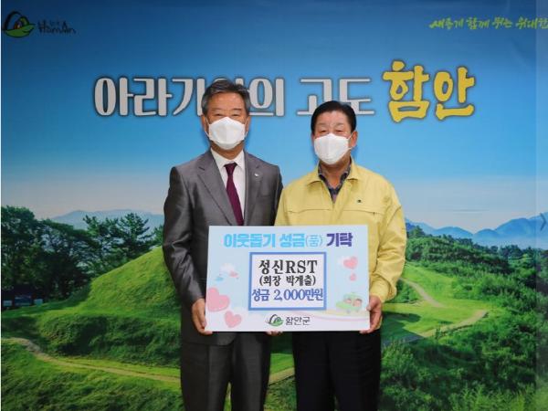 ㈜성신RST(대표 박계출)와 함안상공회의소(회장 박계출)는 21일 군청을 방문하여 코로나로 어려움을 겪고 있는 관내 이웃을 위해 써달라며 성금 3000만 원을 기탁했다.