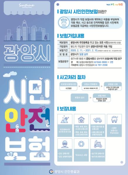 한편, 광양시는 시민이 보험가입 사실을 몰라 혜택을 받지 못하는 경우가 발생하지 않도록 시 홈페이지, 소셜네트워크서비스(SNS), 현수막, 전광판 등 다양한 매체를 통해 홍보에 나서고 있다.