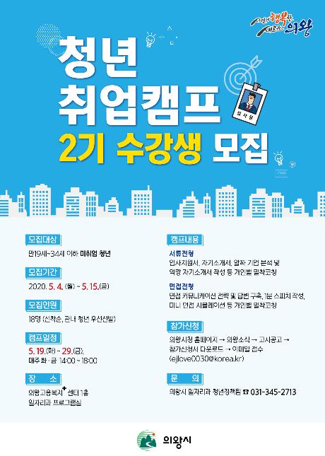 의왕시(시장 김상돈)는 청년들의 취업성공을 위한 취업역량강화 프로그램으로 ‘청년 취업캠프' 1기를 지난 2월에 운영한데 이어 오는 5월 19일부터 2기 프로그램을 운영한다고 밝혔다.